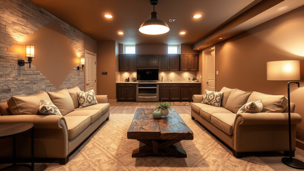 To turn your underutilized basement into a cozy retreat, focus on layering warm, adjustable lighting like dimmable LEDs and natural light from egress windows or glass doors. Prioritize waterproofing to prevent moisture issues and keep the space dry and comfortable. Incorporate soft furnishings, warm colors, and thoughtful decor to create a welcoming atmosphere. By combining these elements, your basement becomes a functional, inviting haven—if you keep exploring, you’ll discover more ways to maximize your space.