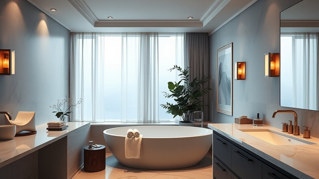 Transforming your bathroom into a spa isn’t just about decor; it’s about creating a sanctuary where you can release stress and reconnect with yourself. Think of your space as a quiet pond, reflecting calm and serenity with every soothing soak. As you add calming scents and soft lighting, you’re planting seeds of peace that bloom each time you step inside. Your bathroom then becomes a treasure chest, holding moments of tranquility just waiting to be uncovered.