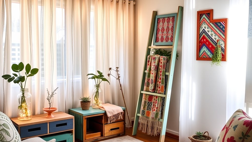 You can add style without high costs by creating DIY wall art using inexpensive supplies like canvas and paint or printable designs. Repurposing furniture also makes a big impact—you could repaint an old piece or add new hardware for a fresh look. These projects are budget-friendly, creative, and give your space personality. Plus, they’re easy to customize, so you get a personalized style without breaking the bank.