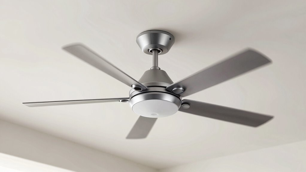 Imagine a gentle breeze whispering through your room—that’s what a smart ceiling fan can deliver, often quieter than traditional fans. Thanks to smart technology and noise reduction features, you enjoy smooth, silent operation while controlling settings with a tap or voice command. These fans adapt to your needs, making your space more peaceful and comfortable without the hum or rattle of older models.
