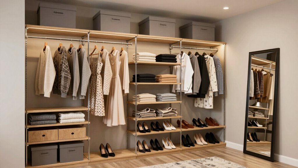 A stitch in time saves nine, so plan ahead for future changes by choosing modular designs and adjustable shelving. You should think about your evolving storage needs and leave room for expansion. Incorporate flexible components that can adapt to your growing wardrobe, making your closet versatile. This way, you won’t have to overhaul everything when your needs change, saving you time and money in the long run.