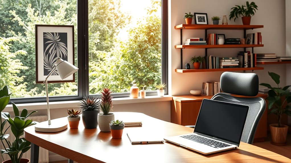 Lighting greatly influences your productivity by boosting your focus and energy. Natural light is ideal, so position your workspace near windows to maximize sunlight, which enhances mood and alertness. Supplement with task lighting that provides focused illumination on your work area, reducing eye strain and increasing efficiency. Proper lighting minimizes distractions, keeps you alert, and creates a comfortable environment that helps you stay motivated and productive throughout the day.