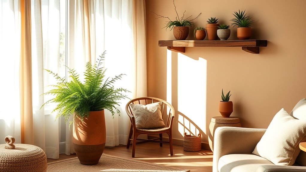 Think of your earthy decor like a living garden—regular care keeps it thriving. To maintain its natural beauty, you should practice soil preservation by avoiding harsh chemicals and cleaning gently. Embrace natural aging, allowing wood and textiles to develop a unique patina over time. Dust surfaces regularly, control humidity, and use eco-friendly products. With consistent attention, your earthy elements will age gracefully, grounding your space beautifully for years.