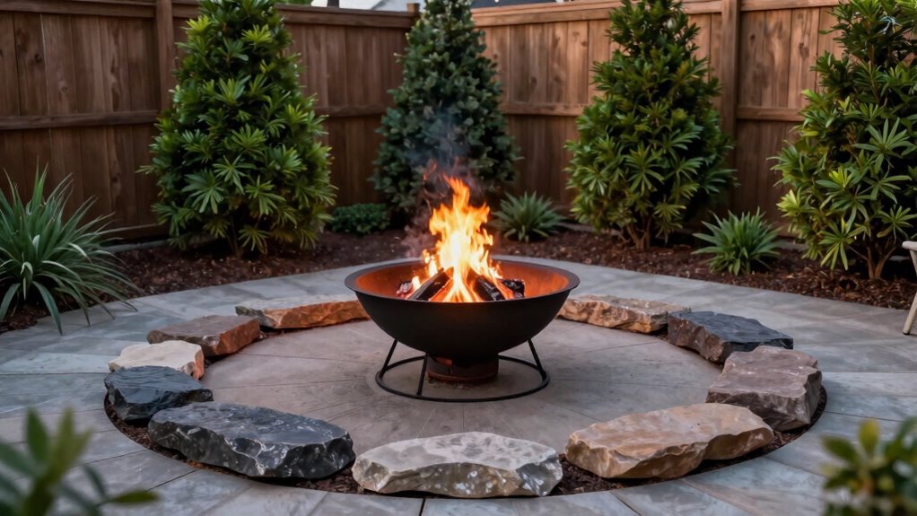 Creating a safe and cozy fire pit area starts with thoughtful placement and careful planning. Choose a flat, open space away from structures, trees, and overhanging branches to prevent hazards. Incorporate fire pit accessories such as spark screens, fire tools, and weatherproof covers to enhance safety and convenience. Surround the fire pit with comfortable outdoor seating that maintains a safe distance, ensuring everyone stays protected from sparks and heat. Use soft lighting like string lights or lanterns to create an inviting atmosphere without compromising visibility. Keep a fire extinguisher or hose nearby for emergencies. Ultimately, add weather-resistant rugs and cushions to make the space welcoming and cozy, encouraging relaxing gatherings while maintaining safety at the forefront.