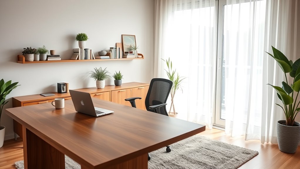You can personalize your home office by adding decorative storage solutions that keep clutter at bay, like stylish baskets or shelves. Incorporate wall art arrangement to reflect your personality without overwhelming the space. Keep surfaces clear by organizing personal items in designated spots, blending functionality with style. This way, your workspace feels uniquely yours, inspiring creativity and comfort, all while maintaining a tidy, professional look.