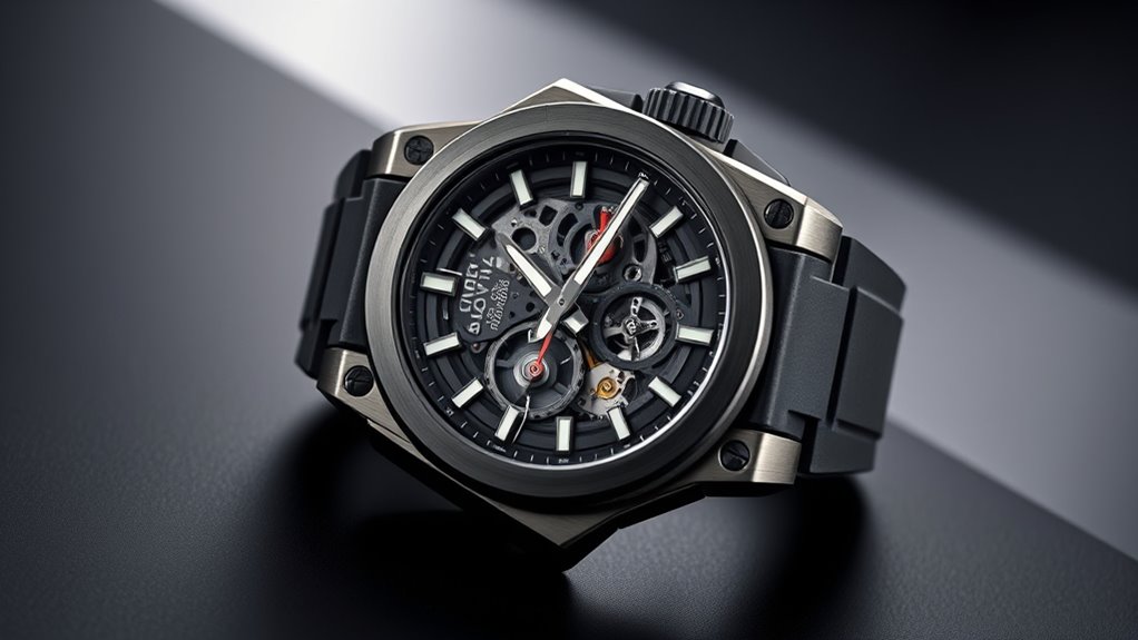 The design of the BR-X3 is inspired by aerospace technology and extreme conditions. You’ll notice its cockpit instrument aesthetic, reminiscent of spacecraft panels, and bold case architecture that mimics high-performance racing components. The multilayer construction, innovative materials like titanium and DLC coatings, and motifs linked to space exploration all emphasize durability, functionality, and an adventurous spirit, making it a striking tribute to aerospace and extreme sports engineering.