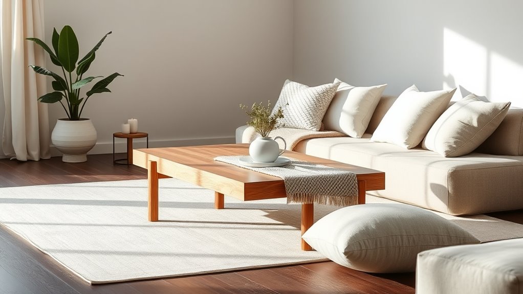 You should focus on balancing functionality and aesthetics in Japandi by keeping minimalist clutter to maintain clean, serene spaces. Use natural materials like wood, linen, and stone to create warmth and harmony. Prioritize simple, practical furniture that serves your needs while enhancing the aesthetic. Avoid unnecessary decorations, and opt for subtle, thoughtful design choices. This approach guarantees your space remains both beautiful and highly functional.