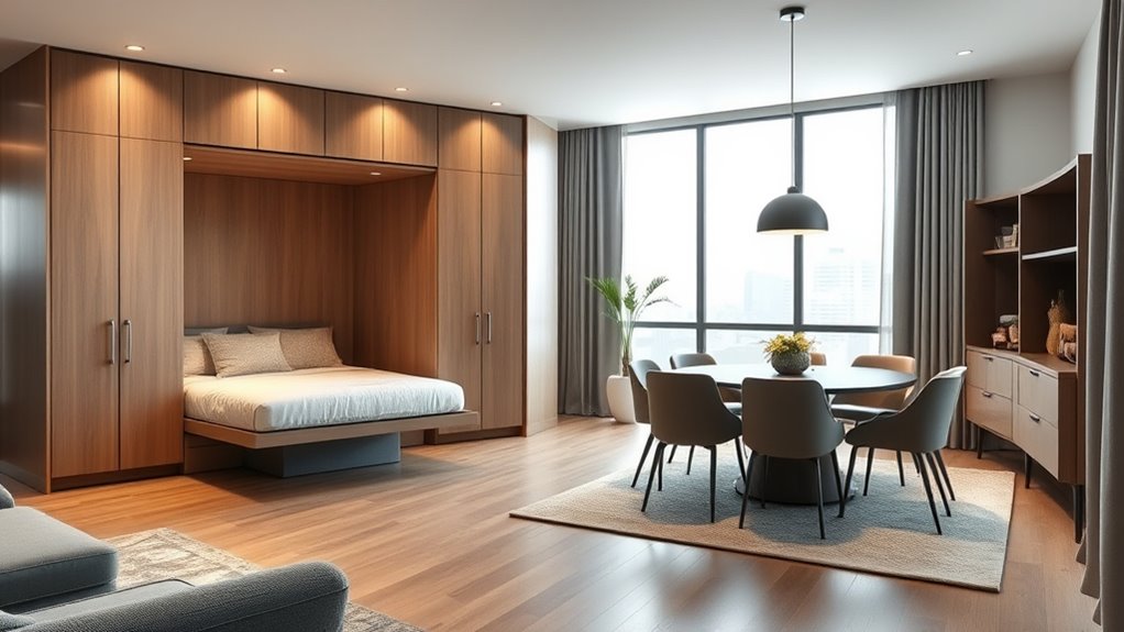 To maximize your small multi-functional space, choose space-saving furniture like fold-away beds or extendable tables that adapt to your needs. Incorporate multi-use storage solutions such as built-in shelves or hidden compartments to keep clutter at bay. Use versatile pieces that serve multiple functions, like a sofa bed or a desk that doubles as a dining area. This approach creates an efficient, flexible environment perfect for your lifestyle.