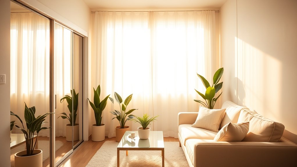 Reflective surfaces can truly boost natural light in your space. Using decorative window films can help bounce sunlight deeper into the room, while reflective ceiling paints can enhance overall brightness. These surfaces catch and reflect light rather than absorb it, making your small room feel more open and airy. Incorporate these ideas to maximize natural light effectively, creating a brighter, more inviting environment without needing additional lighting fixtures.