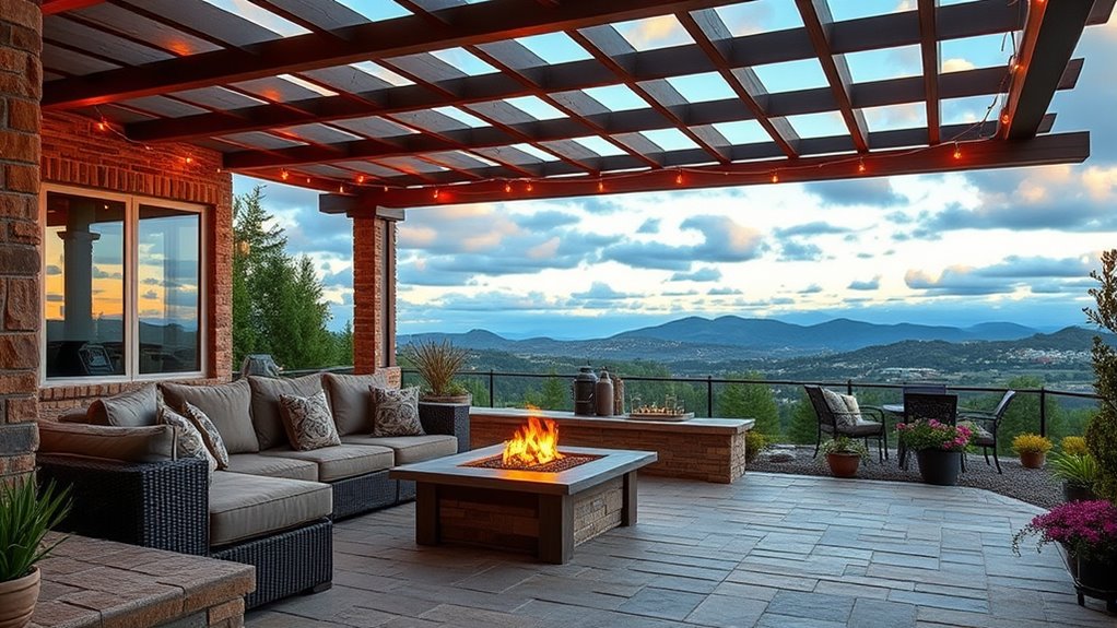 To create an outdoor living space for all seasons, focus on adding features like fire pits to keep warm and set a cozy atmosphere. Incorporate layered lighting for safety and ambiance, and use weather-resistant furniture and curtains for shelter from rain and wind. Plant evergreen shrubs for year-round privacy and greenery. Thoughtful planning around these elements will help you enjoy your outdoor space year-round—keep exploring for even more ideas to make it versatile and inviting.