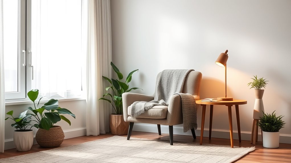 Furniture selection plays a vital role in creating a comfortable, focused environment. Choose a cozy armchair or a small sofa that supports good posture, so you can sit comfortably for extended periods without straining your neck or back. Look for furniture with soft, supportive cushions and armrests to help you relax completely. A small side table is a practical addition, providing space for your drinks, snacks, or bookmarks without cluttering your reading area. When selecting your furniture, prioritize materials and textures that are inviting and soothing—think plush fabrics or natural fibers. Keep the size proportionate to your space; a cluttered or crowded nook can distract you and make it harder to concentrate. The right furniture should invite you to settle in, making it easier to focus on your book and forget about discomfort. Incorporating attention in creative practice can help you fine-tune your space to maximize comfort and focus.