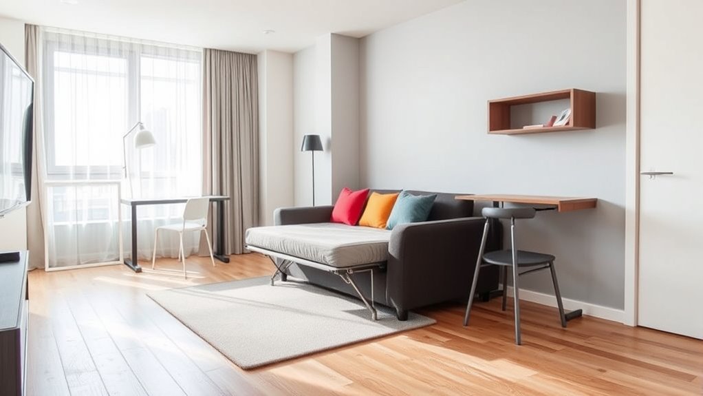 To maximize small spaces, consider multifunctional furniture that offers multiple uses in one piece. Look for sofas that transform into beds, fold-away tables, wall-mounted desks, or storage ottomans. These pieces help reduce clutter while making your space more versatile and organized. Choosing stylish, adaptable furniture means you can get more function without sacrificing decor. Keep exploring for more innovative ideas to transform your room into a flexible, efficient living area.