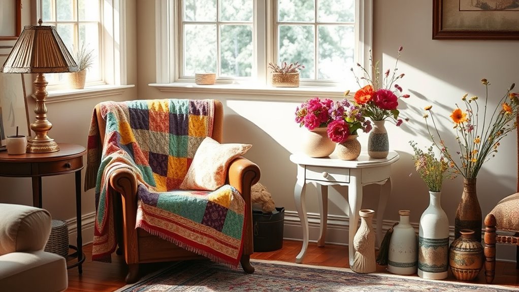When mixing thrifted pieces, focus on blending styles thoughtfully by balancing vintage charm with modern touches. Use color coordination to create harmony; pick a neutral base and add pops of color through accessories or accent pieces. Don’t be afraid to experiment with different textures and patterns, but keep a cohesive palette. This approach helps your eclectic finds look intentional and stylish, making your space uniquely yours.