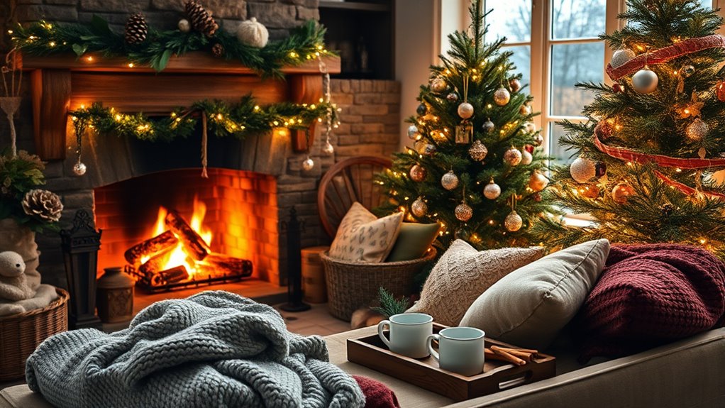 Lighting also plays a essential role in enhancing the cozy atmosphere. Soft, warm-toned bulbs paired with candles or lanterns amplify the comfort factor. Positioning a few well-placed textiles and carefully selected colors can make even a simple room feel like a retreat from the winter cold. Remember, the goal is to craft a space that beckons you to relax and unwind. Incorporate seasonal textiles and colors thoughtfully, balancing textures and hues to evoke warmth and serenity. This approach doesn’t just decorate your home; it transforms it into a welcoming sanctuary that celebrates the season’s beauty. By focusing on cozy textiles and seasonal palettes, you set the foundation for a winter home that’s both stylish and irresistibly inviting.