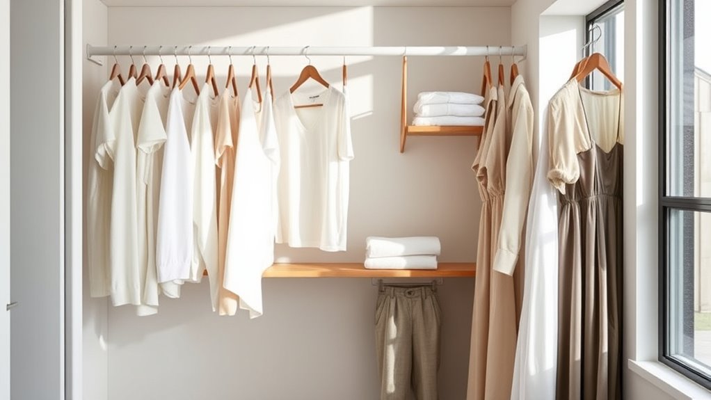 Creating a capsule wardrobe also involves evaluating your lifestyle and personal style. Choose clothes that suit your daily activities and fit your aesthetic preferences. Be honest about what you wear most often and what makes you feel confident. This process ensures that your wardrobe isn’t just minimal but also functional. Over time, you’ll learn to layer pieces thoughtfully, making the most of your limited selection. Incorporate layering techniques and thoughtfully chosen accessories to maximize outfit options. Remember, the goal isn’t just to pare down your closet but to make every piece count. With a little effort, you’ll discover that a well-planned capsule wardrobe not only simplifies your mornings but also helps you express your personal style with ease. Additionally, practicing mindful decluttering can help you maintain an organized wardrobe and prevent clutter from accumulating in the future.