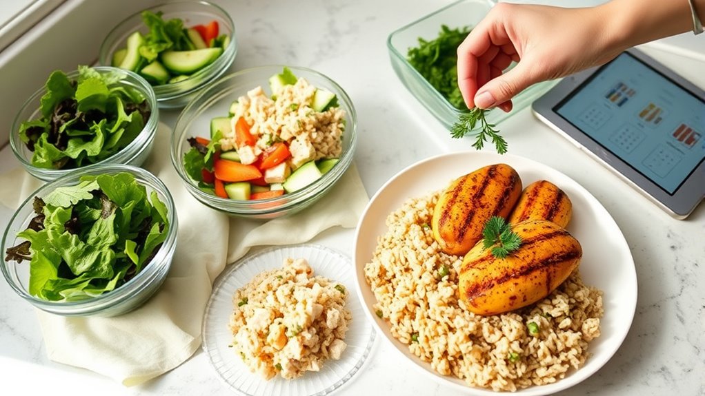 You can save money by choosing affordable ingredients like beans, rice, oats, and frozen veggies. Incorporate these into your meals for nutritious, budget-friendly options. Use meal prep tips such as batch cooking and portioning to maximize savings and reduce waste. Planning weekly menus around sales and seasonal produce also helps keep costs low while ensuring healthy meals for your family.