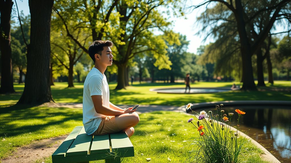 To stay present in a connected world, set intentional digital boundaries like limiting screen time during meals or before bed. Take regular digital detoxes by pausing online activities and enjoying device-free periods, such as weekends or specific hours. Practice mindfulness by questioning if your device use aligns with your well-being and choosing activities that nourish your mind and body. Keeping these habits in place helps you connect more deeply with yourself and your surroundings—more tips await if you keep exploring.