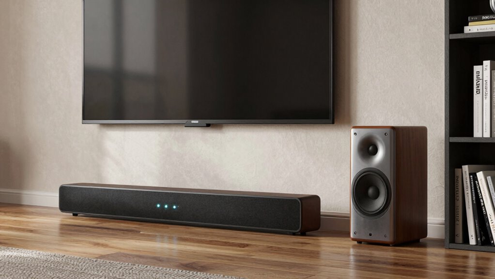 While a Dolby Atmos soundbar can dramatically improve your home audio experience, it requires careful space planning and placement. Proper setup ensures ideal sound distribution and immersion. Your room acoustics and furniture placement play essential roles in achieving this.