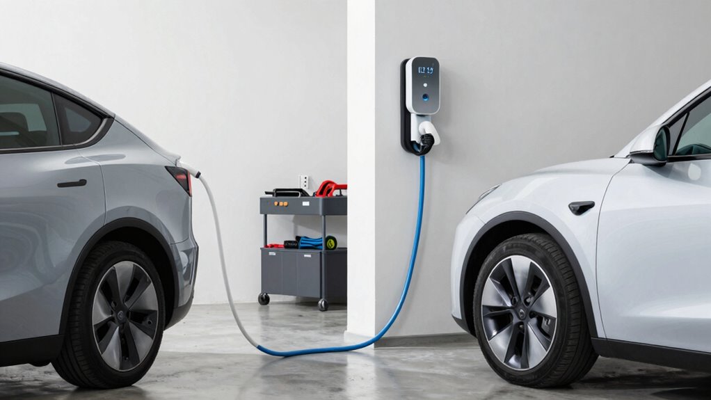 Charging times vary considerably between the two main home options, so it’s important to understand how long each takes to replenish your EV’s battery. With a Level 1 charger, your charging speed is slower, typically adding about 3-5 miles of range per hour. This means it could take 20-40 hours to fully charge a battery with a high capacity. In contrast, a Level 2 charger offers a faster charging speed, often providing 25-30 miles of range per hour. For an average battery capacity, it might take only 4-8 hours to fully charge. Your actual charging time depends on your EV’s battery capacity and the charger’s power output. Overall, Level 2 chargers considerably cut down your charging times compared to Level 1 options.