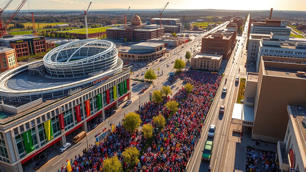 Preparing for the 2026 World Cup can considerably boost Missouri’s economy by upgrading stadiums and infrastructure, creating jobs, and attracting tourists. As new facilities and transportation links develop, you’ll see benefits like increased business activity, higher employment, and community revitalization. These improvements help extend the event’s impact well beyond 2026, positioning Missouri for sustained growth. Keep exploring to see how these opportunities can transform your local area in unexpected ways.