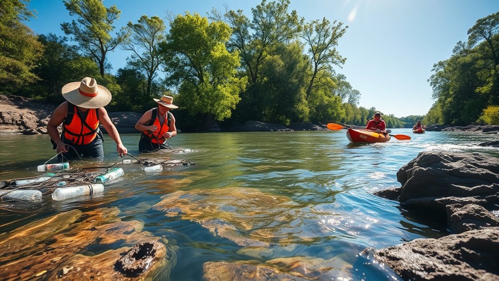 Participating in river cleanups is one of the most direct ways you can help reduce pollution and restore habitat health. When you gather volunteers to pick up trash along the banks, you’re removing plastics, bottles, and other debris that would otherwise drift into the water. This prevents these materials from breaking down into microplastics, which are especially hazardous to aquatic life. Cleanups also help prevent pollutants from leaching into the water, which could contaminate drinking supplies or harm wildlife. Your active involvement not only clears the river of visible trash but also raises awareness about the importance of keeping these ecosystems pristine. Additionally, engaging in native plant restoration projects further supports habitat stability and water quality.