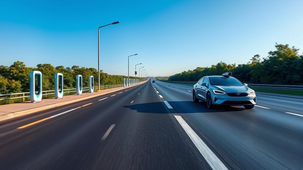 Smart roads will improve your traffic flow by automatically adjusting signals and providing real-time data to optimize routes. As a result, you’ll notice less congestion and smoother commutes. These technologies help reduce traffic jams, making travel quicker and more predictable. By actively managing traffic patterns, smart roads create a more efficient transportation system, so you spend less time stuck in traffic and more time getting to your destination.