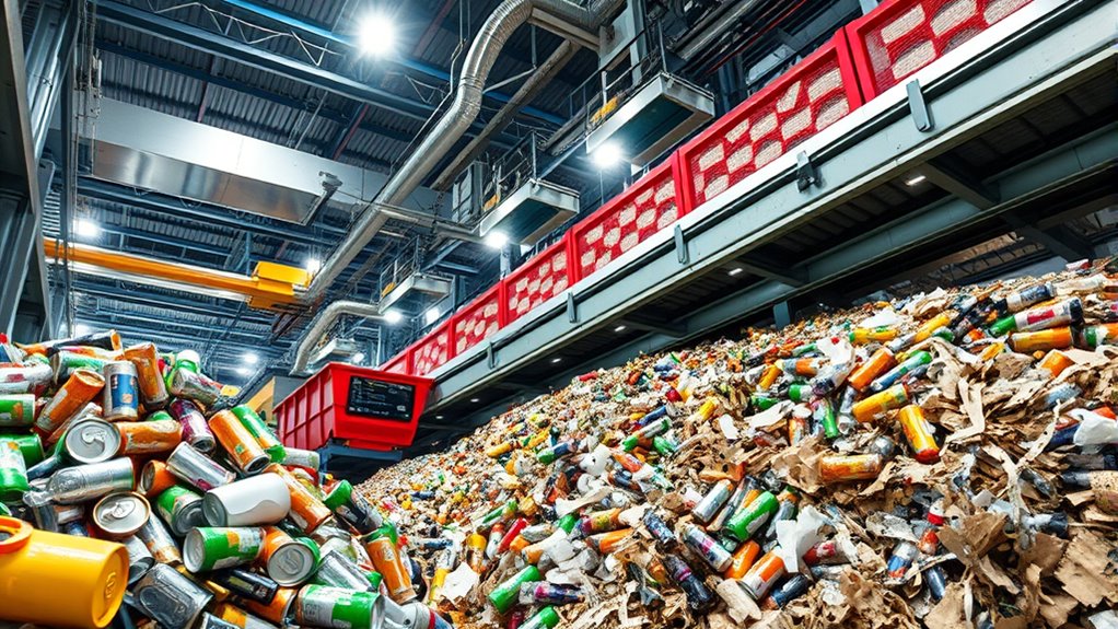 You see recyclables arrive, and sorting technology kicks in to separate them efficiently. As you watch, plastic contamination is identified and removed to guarantee quality. Advanced machines use sensors and conveyor belts to sort materials by type and color, making the process quick and accurate. This technology helps prevent contamination, so only clean recyclables go to the next stage, ensuring the recycling process is effective and environmentally friendly.