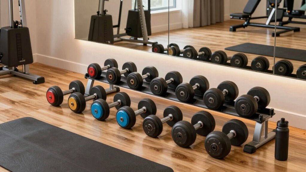 In summary, choosing the right adjustable dumbbell set can be as essential as finding the perfect pair of running shoes; it can make or break your home workout experience. With options like BowFlex and PowerBlock, you’ll find a range that suits your needs and fitness goals. So, take your time, weigh the factors, and invest in a set that’ll help you build strength and stay motivated. Your journey to fitness starts with the right tools in hand!