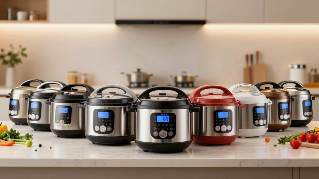 While I appreciate the versatility of electric pressure cookers, I can’t overlook the importance of safety features. With over 10 safety mechanisms, such as overheat protection and automatic lid locking, these cookers prioritize safe operation. I particularly like the easy seal safety lid locks that prevent accidental openings while under pressure, which really minimizes the risk of burns. Safe steam release options, like easy-release steam switches, let me vent built-up pressure quickly without worrying about hot steam burns. Plus, safety indicators, such as float valves, confirm that the lid is securely locked and that pressure is just right. Advanced models even include boil-dry prevention systems to shut off the cooker if it detects insufficient liquid, keeping everything safe.
