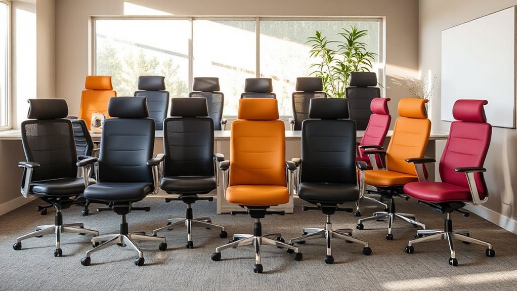 Choosing an ergonomic chair that suits your height can make a significant difference in your comfort and productivity. For taller individuals, it’s vital to look for chairs with adjustable seat heights, ideally accommodating users from 5’4″ to over 6’3″. A height adjustment of at least 3 to 5 inches is necessary to guarantee your legs are positioned correctly, enhancing comfort. Additionally, an adjustable seat depth lets you support your thighs without cutting off circulation. I recommend chairs with a pneumatic height adjustment mechanism for easy customization. Don’t forget the importance of an adjustable headrest, which provides necessary neck support and reduces strain during long hours of sitting. Finding these features can transform your workspace experience!