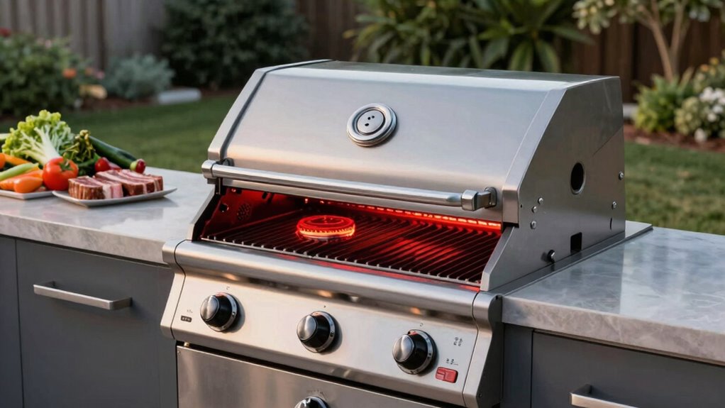 You might think infrared burners are just a flashy feature, but they’re actually more energy-efficient than traditional burners. I’ve found they heat up faster, transfer heat more directly, and use less gas overall. This means I get quick, even cooking without wasting fuel. If you’re looking to save energy and cook efficiently, infrared burners are a smart choice—plus, they give your grilling a nice, even sear every time.