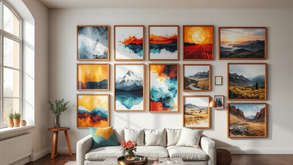 Choosing the right size and dimensions for large wall art can make or break the overall look of your space. I always consider the dimensions of the artwork to guarantee it complements the scale of the wall and surrounding furniture, creating a balanced visual. A large piece can serve as a stunning focal point, while multiple smaller pieces work well for a cohesive gallery wall. I recommend measuring the wall space and accounting for any obstacles like windows or doors. Standard sizes typically range from 24×36 inches to 36×72 inches, which can greatly influence a room’s aesthetic. Finally, I always hang the art so that the center is at eye level—about 57-60 inches from the floor—for ideal viewing.
