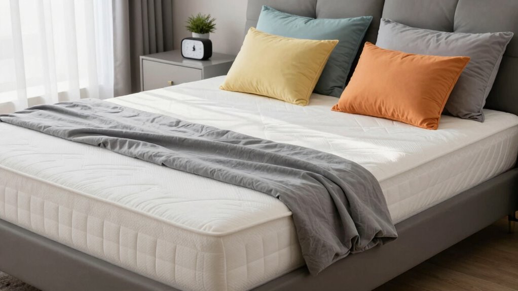 When choosing a mattress for back pain, reducing motion transfer is a key factor to contemplate. Mattresses with pocketed coils or independent support systems are excellent because they isolate movement, keeping it confined to specific areas. Memory foam and gel-infused foam beds excel at dampening partner movements, minimizing sleep disturbances. Multiple foam layers and materials like egg crate foam boost shock absorption, further decreasing motion transfer. Reinforced edges and uniform support layers also prevent movement from spreading across the entire surface, maintaining stability. Reduced motion transfer creates a more restful sleep environment, especially for couples sharing a bed. By prioritizing these features, you can enjoy fewer disruptions and wake up feeling more refreshed, which is essential for alleviating back pain and improving overall sleep quality.
