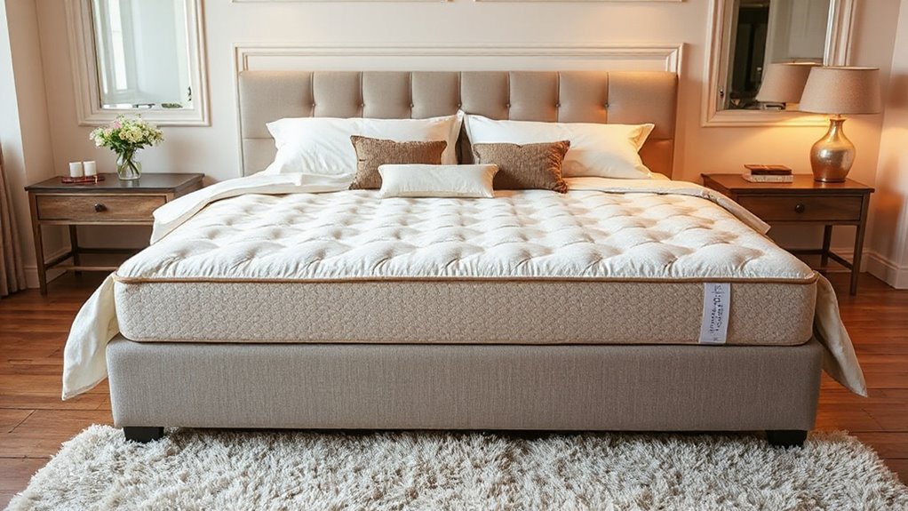 After considering the importance of pressure relief design, I can’t overlook the significance of safety certifications when selecting a memory foam mattress king. Certifications like CertiPUR-US and OEKO-TEX guarantee that the foam is free from harmful chemicals and emissions, creating a healthier sleep environment. CertiPUR-US assures the foam meets strict standards for content and durability, giving me peace of mind about its safety. OEKO-TEX guarantees that the mattress cover and materials have been tested for harmful substances, making them safe for human use. By choosing a mattress with these recognized certifications, I can greatly reduce the risk of off-gassing and improve indoor air quality, ultimately enhancing my overall sleep experience. Trust me, safety matters!