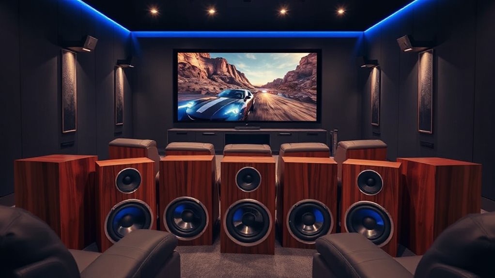 The frequency response range of a powered subwoofer is essential for delivering the deep, immersive bass that elevates your home theater experience. Typically measured in Hertz (Hz), this range indicates the lowest and highest frequencies the sub can reproduce. For a superior experience, look for a subwoofer that extends down to around 20-40Hz, perfect for deep bass in movies and music. Higher frequency responses, reaching up to 200Hz, can enhance compatibility with various audio content and speaker systems. A well-balanced frequency response prevents distortion and guarantees seamless blending of low frequencies with mid and high frequencies from other speakers. So, always consider the frequency range in relation to your overall audio system for the best performance.