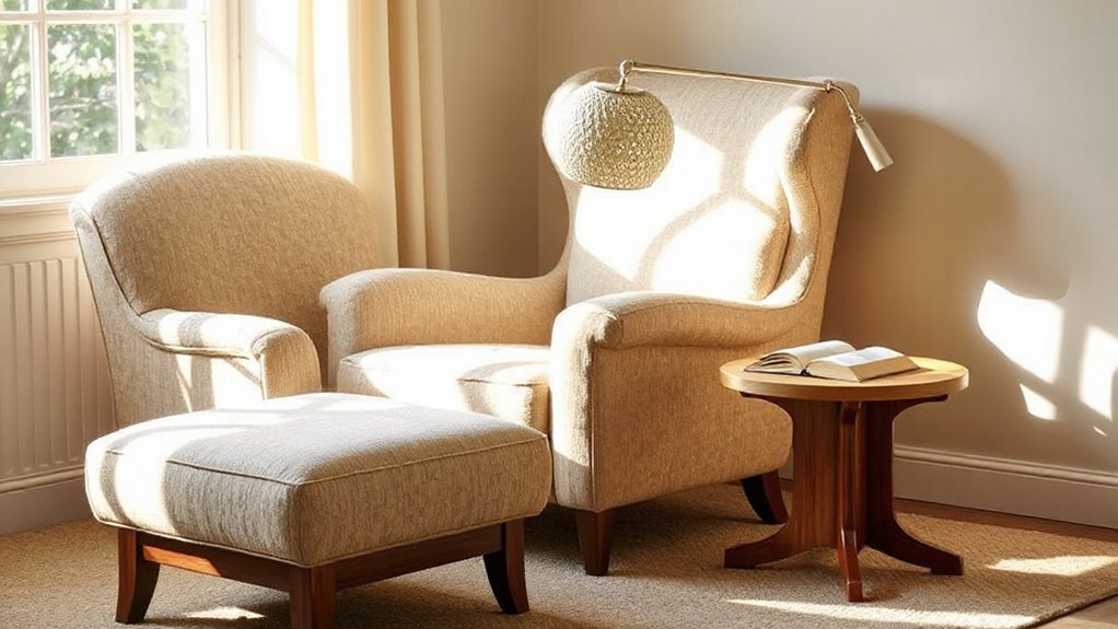 Selecting the right materials and fabrics is essential for guaranteeing your reading chair with ottoman remains comfortable and durable over time. High-quality options like soft velvet, sturdy polyester, and plush chenille boost both comfort and longevity. Fabric density and weave matter, as they determine resistance to wear, pilling, and fading, helping your chair look newer longer. Breathable fabrics such as cotton blends and mesh promote airflow, keeping you cool during long reading sessions. Removable and washable covers make maintenance simple, preserving the chair’s appearance with minimal effort. Additionally, your choice of fabric influences the overall aesthetic and tactile experience, allowing you to match your decor while enjoying a cozy, inviting spot to unwind. Prioritizing quality materials guarantees your chair stays beautiful and comfortable for years.