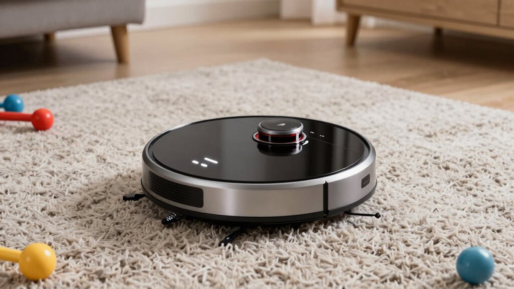 Effective navigation is essential for robot vacuums tackling thick carpets, as it guarantees thorough cleaning of complex and cluttered spaces. Advanced technologies like 360° LiDAR vision or ClearView LiDAR enable the vacuum to create detailed maps, helping it navigate around furniture and obstacles with precision. Sensors play a significant role by preventing falls down stairs and adapting to environmental changes, ensuring no area is missed. Robots with floor detection algorithms can automatically adjust suction power when moving from hard floors to thick carpets, optimizing cleaning efficiency. Additionally, features like setting no-go zones and multi-floor mapping allow the vacuum to focus on high-traffic carpeted areas while avoiding sensitive spots. These navigation capabilities are essential for achieving a deep, extensive clean in challenging home environments.