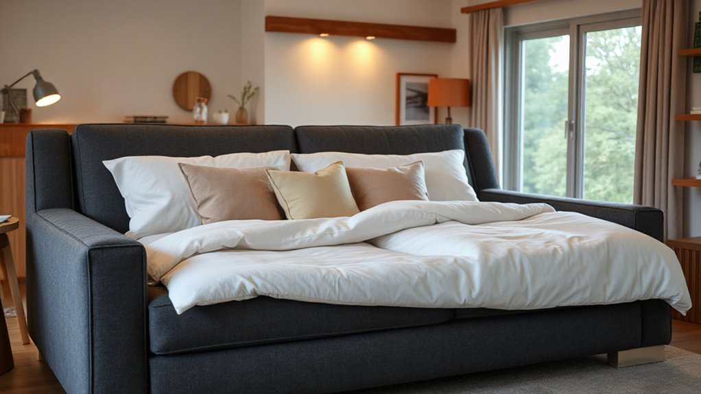 Maximizing space and convenience, I look for sleeper sofas with built-in storage compartments that hide bedding, pillows, and other essentials. These storage options keep my living area tidy and make the most of limited space. I also check if the sofa offers additional features like USB ports, pockets, or side organizers, which add to its functionality and ease of use. It’s helpful if the sofa comes with extra accessories such as pillows, cushions, or even an additional mattress to enhance comfort. I pay close attention to how accessible and organized the storage is, ensuring it doesn’t compromise the sofa’s style. finally, I prioritize storage that’s durable and seamlessly integrated into the design, ensuring long-term practicality without sacrificing aesthetics.