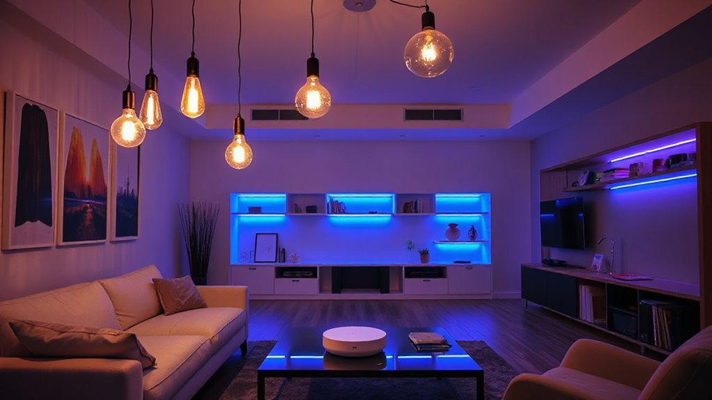 Understanding hub connectivity types is essential for maximizing the potential of your smart lighting system. I’ve found that the choice between Zigbee, Z-Wave, and Wi-Fi can dramatically impact performance and reliability. Zigbee hubs are great because they offer a stable, low-power connection, allowing multiple devices without hogging Wi-Fi bandwidth. On the other hand, Wi-Fi hubs are easier to set up, connecting directly to your home network, but they can struggle with congestion when many devices are active. Additionally, consider systems that utilize the Matter protocol, which boosts interoperability and guarantees secure connections. Ultimately, the right hub connectivity type will influence how seamlessly you control your lights and integrate them into your home.