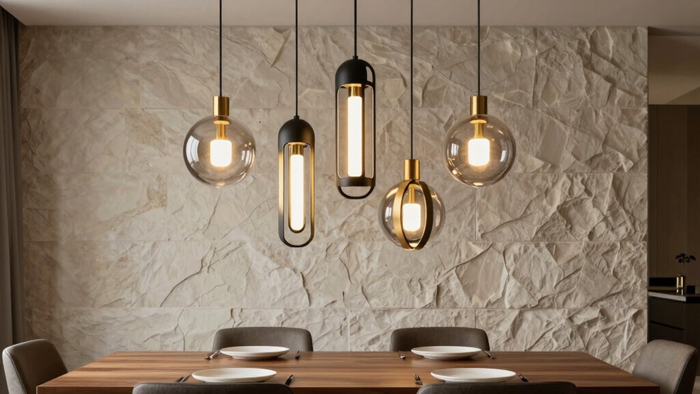 Dimming capabilities are an essential feature to contemplate when choosing a statement pendant light for your dining room, as they allow you to easily set the perfect mood for any occasion. Not all pendant lights are dimmable, so it’s important to check if the fixture and bulbs support dimming before buying. Using compatible dimmer switches with dimmable LED bulbs gives you seamless control over brightness, helping you create a cozy or lively atmosphere. Keep in mind, LED bulbs often need specific dimmer switches designed for LED technology to prevent flickering. Additionally, dimming can extend bulb lifespan and save energy by allowing you to lower the light level when full brightness isn’t necessary. This feature adds both versatility and efficiency to your dining space.