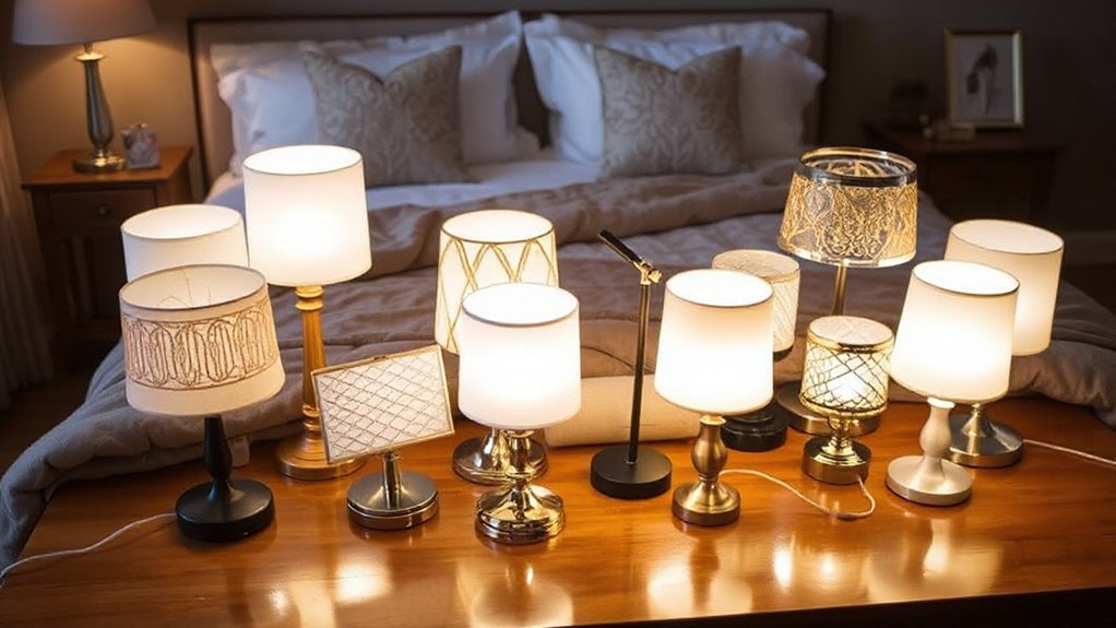 Choosing the right size and proportion for your table lamp set is essential to achieving balance in your bedroom. I always check the height of the lamps to guarantee they’re proportionate to my nightstands; ideally, the bottom of the lampshade should be at or just above eye level when seated. Additionally, I consider the diameter of the lamp’s base—wider bases offer stability, while smaller ones fit compact spaces better. In larger rooms, taller lamps can make a statement, while shorter designs are perfect for cozy bedrooms. Most importantly, I guarantee the lamps complement my existing decor without overwhelming the space. This balance creates a harmonious aesthetic that enhances my bedroom’s overall design.