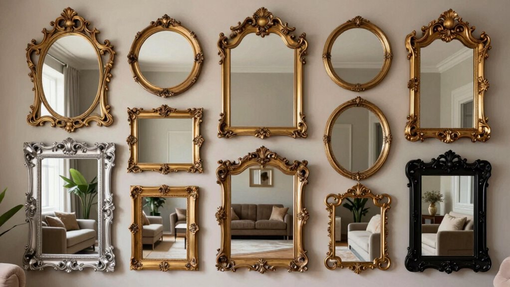 To create a cohesive and visually appealing space, it’s essential to select a large decorative wall mirror that complements your existing interior style. If your decor is classic, opt for ornate gold frames that add elegance; for modern spaces, sleek black metal mirrors work best. Consider the mirror’s shape—round, rectangular, or scalloped—to harmonize with other wall art or architectural features. Match the frame material with other fixtures or furniture, like wood, metal, or mirrored surfaces, to unify the look. Use size and proportion thoughtfully—large mirrors should balance with other statement pieces without overpowering the room. Adding design elements such as beaded borders, scalloped edges, or textured frames can provide visual interest and enhance your overall decor style.