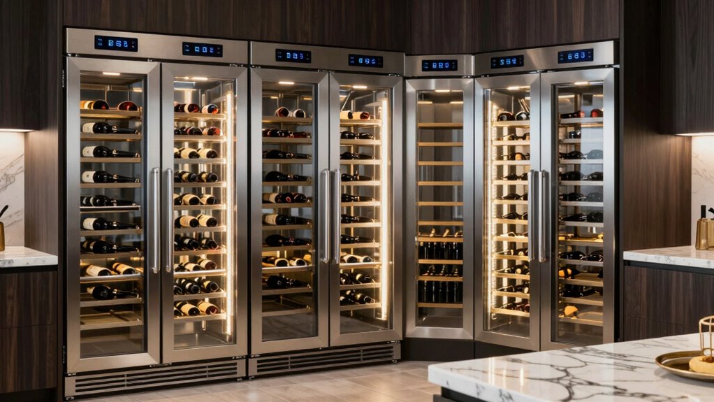 Imagine creating the perfect climate for your wines—built-in models expertly manage humidity through a small, sophisticated system that maintains ideal moisture levels. I’ve found that these coolers use vents and sensors to regulate humidity, preventing corks from drying out or mold from forming. This guarantees your wine stays fresh and flavorful over time. It’s a subtle but essential feature that keeps your collection in top condition without you even noticing.