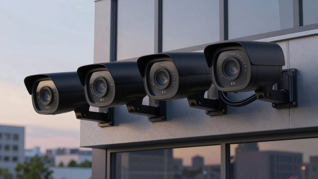 Night vision capabilities play a vital role in ensuring your wired security camera system remains effective after dark. I look for cameras with IR night vision that can reach at least 30 meters (around 100 feet) to cover large areas clearly. Multiple night vision modes, like infrared, color night vision, and smart options, help adapt to varying lighting conditions, so I get clear footage no matter the situation. High-quality IR LEDs are essential—they produce sharp black-and-white images without glare or noise in complete darkness. Additional features like spotlight illumination or alarm lights activate during nighttime detection, boosting visibility and acting as deterrents. I also value adjustable night vision settings or privacy masks, which optimize image quality and protect privacy in specific zones.