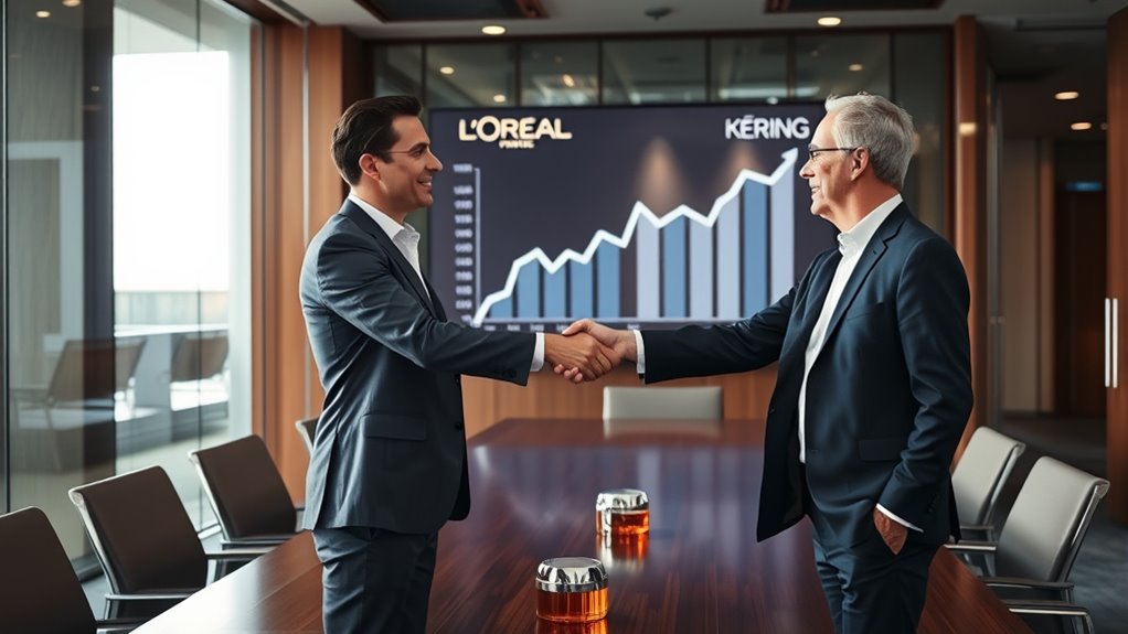 L’Oréal’s $4.6 billion acquisition of Kering’s beauty division is a strategic move to boost its presence in the luxury and premium cosmetics markets. This deal adds several high-end brands to L’Oréal’s portfolio, helping you access a broader range of innovative, luxury products. It also signals a focus on growth and industry leadership through consolidation. If you keep exploring, you’ll discover how this deal could reshape the future of beauty industry dynamics.